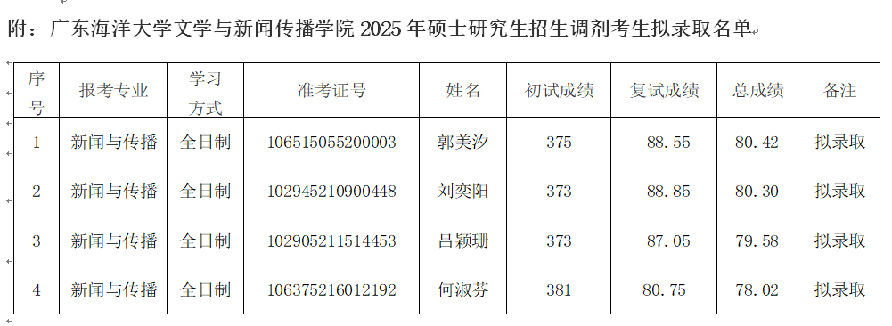 现将我院2025年硕士研究生招生调剂考生拟录取名单进行公示。