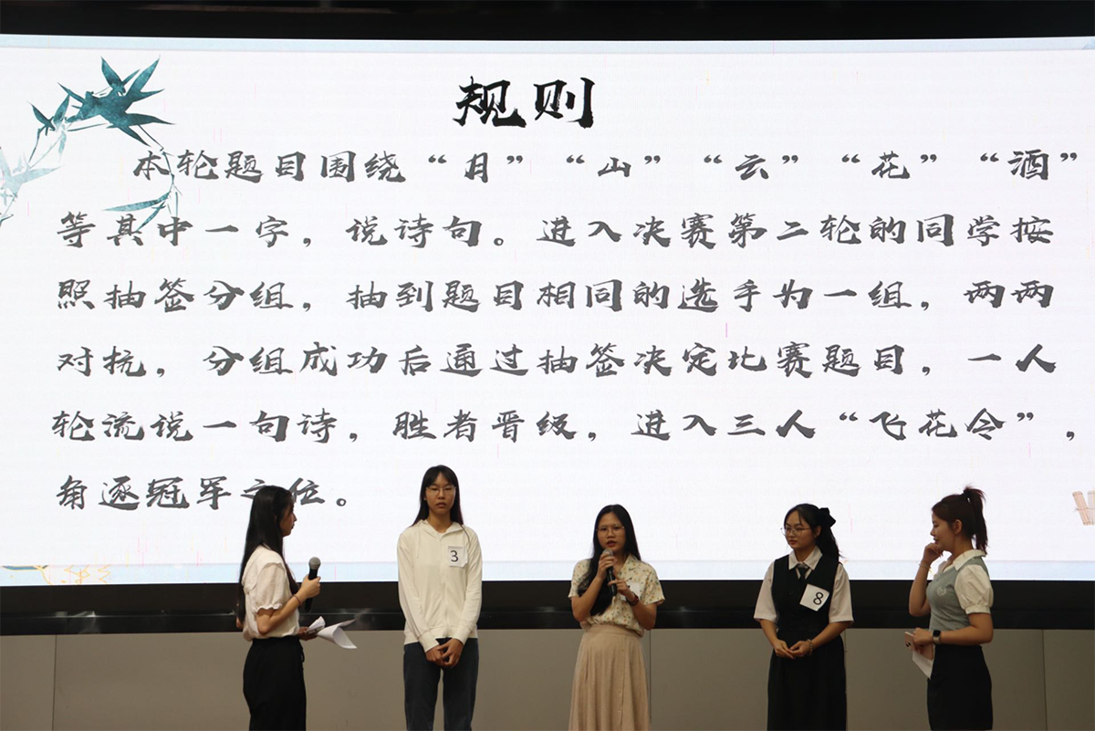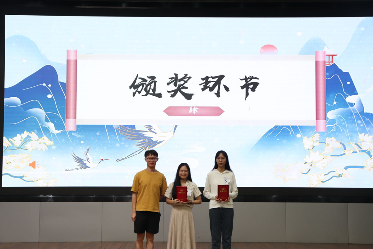 本次古诗词大会分为初赛和决赛两个部分:初赛以线上答题形式考察学生对古诗词知识的积累,共有300多名学生参加,最后前12名晋级决赛;决赛分为诗词接龙抢答和“飞花令”冠军争夺赛两轮,诗词接龙抢答后,共有6名选手进入“飞花令”冠军争夺赛。选手们腹笥丰盈、敏捷如电,精彩表现赢得掌声不断。最终,汉教1212班曹倩怡、汉教1222班余悦、汉教1211班程潆分别获得前三名,而曹倩怡、余悦作为校赛前两名选手,将代表学校参加“2024中国诗词大会”广东省选拔赛。