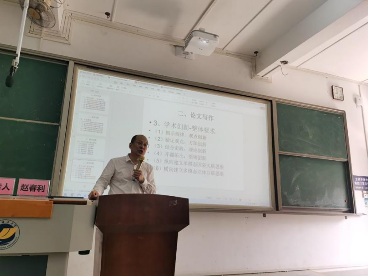 赵春利教授是暨南大学文学院博士生导师、博士后合作导师,珠江学者特聘教授。他在报告中围绕研究方法与论文写作两个问题,从研究选题、文献整理、学术创新、思维导论、哲学范畴、逻辑推理等方面展开阐述,并以自己发表的论文为例进行生动阐释和精细剖析,分享了自己的研究体会和学术经验,具有很强的专业性和操作性。