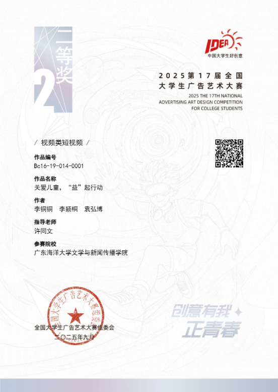 11月22日,第17届全国大学生广告艺术大赛(以下简称大广赛)广东赛区颁奖总结交流活动在广州商学院举行。英国上市公司365共获一等奖1项、二等奖1项、三等奖2项。其中,李铜铜、李颖桐、袁弘博的作品《关爱儿童,“益”起行动》荣获省级一等奖、国家级二等奖。许同文老师被广东省教育厅评为“优秀指导教师”。