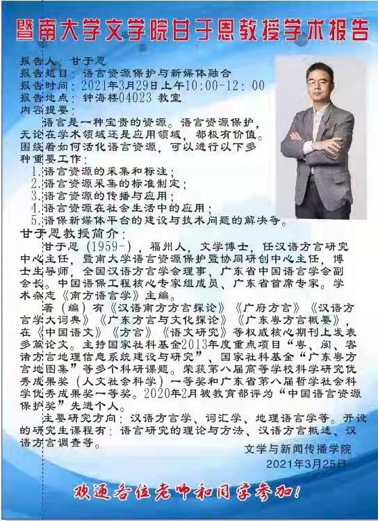 上一条:暨南大学文学院甘于恩教授受邀莅临海大讲学