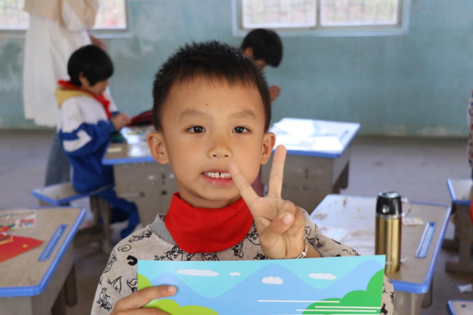 在完成贴画制作后,志愿者们将准备好的贴纸、徽章作为礼物分发给各年级小朋友,并教导他们正确的使用方式。最后,志愿者与小朋友们进行合影留念,活动圆满结束。