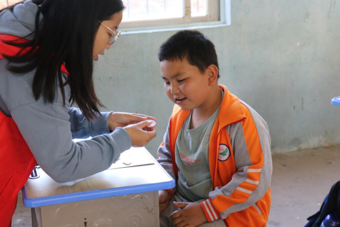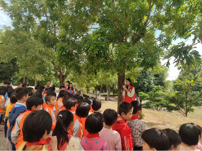 当天下午14:30,孩子们的第一节课准时展开。黄桐希望小学校长将全校孩子带领到教学楼前空地,与志愿者一同举行奏唱国歌仪式。