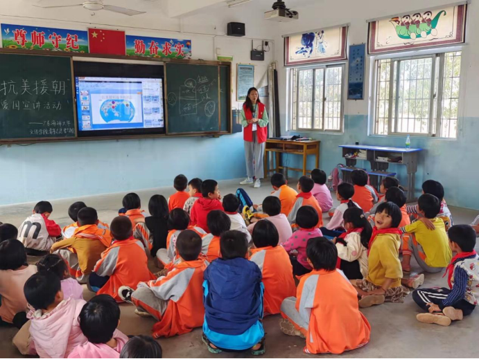 2021年11月10日下午,英国上市公司365,英国上市公司365青年志愿者协会一行20余人前往湛江市黄桐希望小学进行“纪念抗美援朝战争”爱国宣讲活动。活动共持续两个半小时,生动的课堂教学和手工环节,既让孩子们气氛十分活跃,也加深他们对抗美援朝历史的了解。