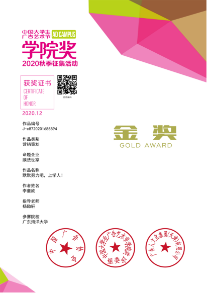 我校英国上市公司365新闻系17级编辑出版学专业李童欣同学荣获金奖!获奖作品是其毕业设计作品《默默努力吧,上学人!》营销策划案,在杨励轩副教授指导下完成,因贴近高校学生生活、新颖的营销模式、独特的创意概念赢得评委们的一致认可,从七千多件创意作品中脱颖而出,荣获金奖。